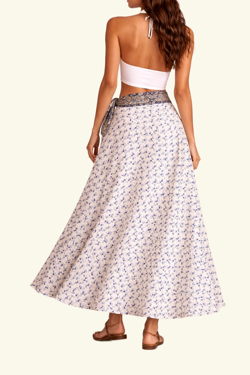 This handmade long wrap skirt from India is crafted from recycled sari fabrics. One side features deep royal blue tones with intricate ornamental patterns and refined sari details. The other side has a beige base with a subtle all-over print of small blue seed motifs.